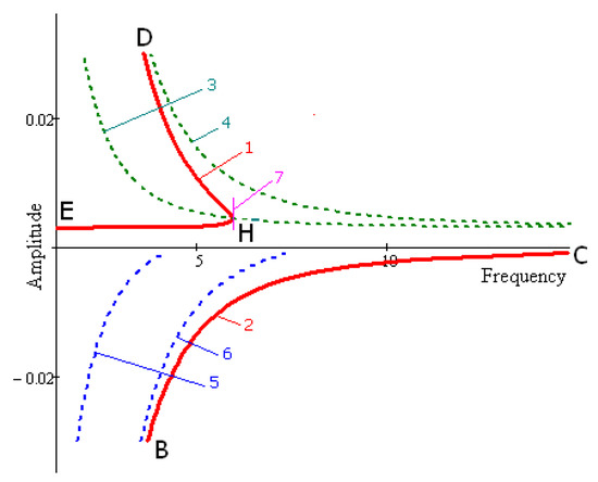In Figure 11 resonant curves are drawn by Equation (42). There are two branches in these graphs with respective positive and negative means of amplitude A. In Figure 11 borders of stability, built by Formula (47) are shown by lines 3; 4 and 5; 6 (lines 3; 4 for positive, lines 5; 6 for negative amplitude). From the physical perspective, positiveness of amplitude signifies phase coincidence, but negativeness of amplitudes signifies opposite-phase. Tangent lines to resonant lines are parallel to axes 7.
