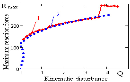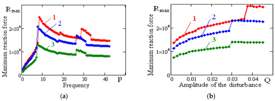 Figure 14 shows the dependence of the maximum reaction force of a vibration-protected body on rolling element linear guides on the disturbance amplitude for the first rolling element linear guide model: curve-1 has been constructed using the numerical method, and curve-2-using the analytical method. Similar curves are shown in Figure 13, which gives an idea of how close the results of analytical and numerical calculations are. The frequency of the kinematic disturbances is .