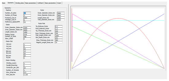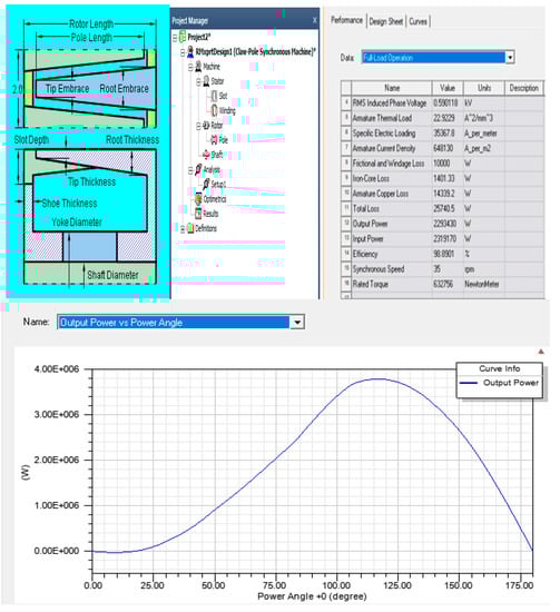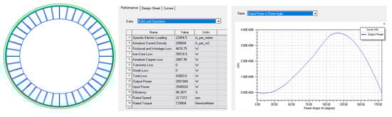 Next, the results of the calculation of the optimal geometry and winding data are transmitted to the program Ansys Electronics Desktop using a pre-developed script. In this program, the calculated parameters are checked in RMxprt mode. The ANSYS software package has a proven methodology for analyzing this type of machine (CPSM). The results of the work at this stage are presented in Figure 4.