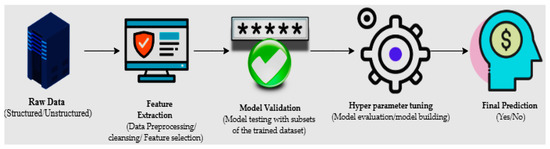 The machine learning process starts with structured or unstructured data from different sources. The next step is data preparation or data preprocessing, which involves data selection through a data mining method in which original or raw data is converted into an understandable format [7]. Once the data is ready, the model tests different trained data-sets to calculate accuracy or perform statistical algorithms; this is known as model validation [8]. Model optimization or model improvement is done by hyperparameter tuning for final validation to perform prediction, and classification (Figure 1).