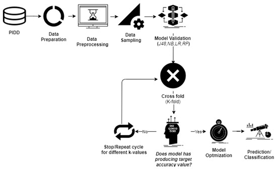In this study, four ML classifiers were employed to conduct different cross-validations. The k-fold CV technique was used to perform model validation. The PIDD was split into ‘k’ folds to conduct training with test data, and the remaining ‘k-1’ folds were combined to form trained data. Original data were randomly separated into ‘k’ folds (k1,k2…,ki), and the model testing was performed by ‘k’ times. For example, in the first iteration, if subset (k1) served as test data, then the remaining subsets (k2,……,ki) were combined to conduct model training, and this process was repeated for the rest of the ‘k’ values. Many studies reported that in order to avoid issues associated with imbalanced data-sets, the optimal value for ‘k’ should be 5 or 10. With the highest (k) values, the difference in trained and sampled data-sets tended to acquire low values. In the present study, model validation was conducted with k = 5, 10, 15, and 20.