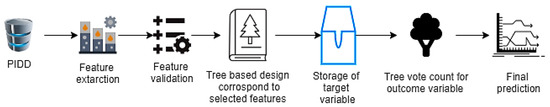 When feature selection methods are used, the RF algorithm is quick to learn to produce the highest classification accuracy on large databases, because of the tree-based systems used. Generally, these trees are nicely positioned for improving the virtue of the tree node known as the Gini impurity [24]. In RF, feature extraction is conducted from the test data. Thereafter, test features are validated by the randomly generated decision trees (Figure 4). In the example of PIDD, if the model was generated 50 random trees, every tree could predict two different outcomes for the same test group. If 30 trees were predicted (tested positive) and 20 trees were predicted (tested negative), then the RF algorithm returns ‘tested positive’ as the predicted target.