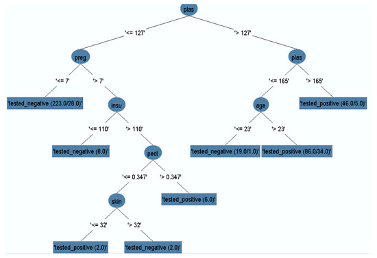 The J48 model classifier was exposed with the remained dataset (after removal of missing instances) to generate a pruned decision tree. The output pruned decision tree with plasma value as a central node is represented in Figure 5. It is obvious that plasma glucose concentration has the highest information gain, which could be considered as the highest risk factor for diabetes. Other risk factors such as multiple pregnancies, release of high levels of insulin, and lineage function also increased the chances of having diabetes. Generally, pregnant women who do not take much physical exercise have higher chances of gaining weight, which in turn increases the likelihood of having Type 2 diabetes.