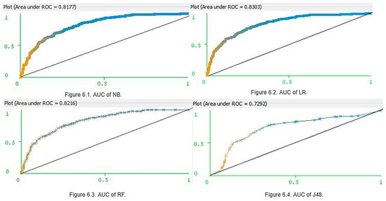 These results clearly show that the four classifiers had similar prediction accuracy with small differences and margins of error. However, LR was the most accurate and J48 was the least accurate. Ultimately, LR, NB, and RF were deemed to be the three best models for predicting whether a patient is diabetic or not. Furthermore, for K = (5, 10, and 20), the NB parameters for accuracy, precision, recall, and f-scores were higher than those of RF. However, for K = 15, the RF precision and F-scores were higher than those of NB. Accuracy was not only the parameter, which can be used in assessing model optimization. The main limitation in using accuracy as the key performance metric is that it does not work well in datasets. This can generate class imbalances. The PIDD (Table 1) contains 500 women who tested negative for diabetes, and 268 women who tested positive for diabetes, and thus the imbalance ratio is 1.87. Hence, along with accuracy, it is also important to consider the AUC values (Figure 6). The AUC values of NB (Figure 6.1) and LR (Figure 6.2) were 0.81 and 0.83, respectively, and for RF (Figure 6.3), it was 0.82 and 0.81. However, J48 produced a lower AUC value (0.72) than others (Figure 6.4). When each classifier is ranked according to performance values, once seems that an optimized model is LR > RF > NB > J48.