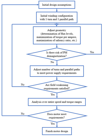 The development of high-performance permanent magnet (PM) motors in electric vehicles (EVs) presents engineers with the challenge of developing new designs to increase efficiency and power density while reducing the cost of the electromechanical devices [1]. The conventional design process for PM motors is based on utilizing analytical calculations given in generalized form which is labor-intensive and difficult to follow [2,3]. With the progress in computer and simulation technologies on the one hand and increasing demand for superior motor characteristics on the other hand, the advanced computer-based simulation tools become an essential part of the design process. Not only do they assist in better understanding of the behavior of the device under different operating conditions, but also allow performance optimization and cost reduction through better material utilization and minimizing the number of prototypes required during the development process [4,5]. The PM motor design methodology proposed in this paper is intended to transform the conventional textbook design process from a generalized form to a definite workflow centered on the use of a computer-based simulation tool.
