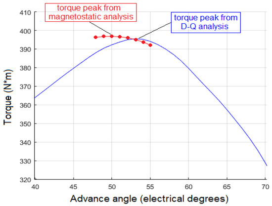 Torque versus advance angle curves obtained with d-q analysis (blue) and time-stepping magnetostatic finite-element (FE) analysis (red).