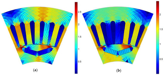 Flux lines and magnetic flux density distributions (in Wb/m) for: (a) rated current density, (b) quarter of rated current density.