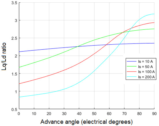 In IPM motors, inserting PMs deeper into the rotor steel decreases magnet torque component in comparison to surface PM motors. This is due to the fact that the distance between magnets and the stator becomes larger and magnetic flux travels a longer distance. This is compensated by the reluctance torque component, which is determined by the saliency ratio, Lq/Ld. The saliency ratio, in turn, is affected by the rotor geometry and stator winding configuration [26,27]. Figure 5 shows curves of the saliency ratio versus the advance angle for different stator currents generated using the d-q analysis of MotorAnalysis-PM. It is seen that the saliency ratio changes significantly with a change in current and advance angle. The dependence on the advance angle becomes more evident as the rotor saturates which should be considered while designing the motor. Increasing the saliency ratio with the advance angle is an important factor to consider especially for the field-weakening operation. This means that the reluctance torque component increases during operating conditions when the magnet torque component decreases with the weakened flux of the PMs.