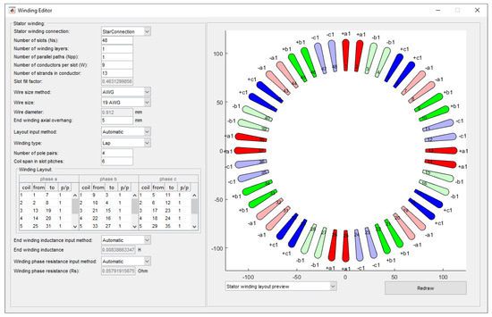 MotorAnalysis-PM is a free and powerful software for design and analysis of PM motors and generators. The software is based on automated FE simulations and establishes a complete set of tools for design and analysis of PM motors. It is based on Matlab and C++ programming language [14,15] and does not require the use of other commercial FE software, making it a good choice for any PM motor manufacturer. MotorAnalysis-PM can analyze several motor topologies including skewed rotor geometries which can be solved with multi-slice FE analysis [14,15]. In addition, it has an automatic and manual stator winding layout generation and can employ different wire-sizing methods [14,15]. The software includes a defined materials library, but also gives the users the flexibility to create and define other materials.
