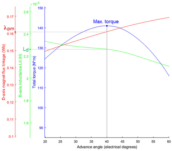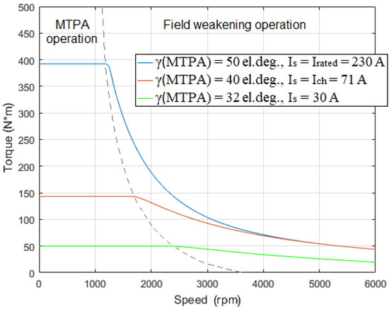 Since λpm and Ld nonlinearly depend on the advance angle γ, the characteristic current is determined for γ at which the maximum torque occurs (MTPA operation is implied). This is illustrated in Figure 7. On the other hand, since the values of λpm and Ld also depend on the stator current, multiple iterations are required and calculation is repeated for different stator currents until Ich converges.