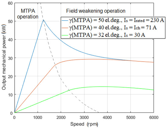 Output mechanical power versus speed curves for different stator currents in MTPA and field-weakening regimes.