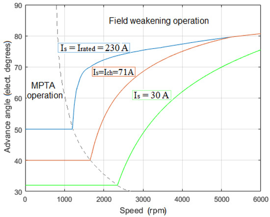 Advance angle versus speed curves for different stator currents in MTPA and field-weakening regimes.