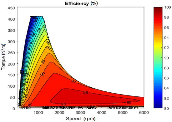 Calculation of the efficiency map is computationally expensive since it requires multiple iterations for every speed-torque pair to find the optimum operating point while considering the constraints of inverter voltage and current limits [33,34,35,36]. To speed up the efficiency map computation, MotorAnalysis-PM uses the analytical steady-state d-q model previously parametrized with FE simulations. This advantage allows the efficiency map to be generated in a matter of few minutes. For instance, the motor efficiency map (Figure 11) with 579 points is generated in 33 minutes with MotorAnalysis-PM (Intel Core i7 2.7 GHz CPU and 16 GB RAM). This is significantly faster compared to commercial FE software packages where many hours or days are necessary to compute the motor efficiency maps and expensive computational resources are necessary for this numerical process [33,34,35,36]. For example, Delafosse et al. utilized ANSYS Maxwell software to compute the efficiency map for the same Prius PM motor presented in this paper using 2-D FE simulations [33]. An efficiency map with 250 points was computed in 2 hours and 19 minutes using a single core and the same efficiency map with 250 points was obtained in 17 minutes using 10 cores [33]. Dlala et al. employed ANSYS Maxwell software to compute the PM motor efficiency map with 400 points in 3 hours using 4 cores [34]. Finally, from references [33] to [36] one can see that in some commercial FE software packages where the efficiency map is calculated solely based on FE simulations, the efficiency map calculation requires significantly more time compared to MotorAnalysis-PM, where a combination of FEM and analytical models are utilized to speed up the simulation process. Furthermore, some commercial FE software packages require purchasing additional licenses for the use of several cores which makes the analysis and designing process even more expensive [37].