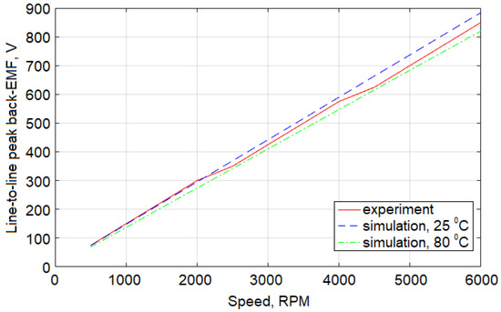 The FE simulation results of the Toyota Prius 2004 PM motor obtained with MotorAnalysis-PM are validated using the experimental data published in [19,20,21]. Figure 12 shows the comparison of simulated and measured peak values of the back-EMF. Numerical results are generated by MotorAnalysis-PM by using time-stepping magnetostatic FE analysis with 200 time steps. Since the stator current during the test is zero, the rotor is heated by the friction and steel core losses in the stator from the rotating magnetic field of the rotor. The temperature of the PMs during the back-EMF test is not reported in the experimental study, and only the oil temperature range of 25–80 °C is available [19,20,21]. Authors assumed that the PMs have the same temperature as the oil, therefore, the simulations are carried out for magnet temperatures of 25 °C and 80 °C. As can be seen, the experimental peak back-EMF characteristic is positioned exactly between the two simulated peak back-EMF lines. For lower speeds, the measured data are closer to simulation results corresponding to 25 °C while for higher speeds it is closer to the simulation results obtained for 80 °C. Comparison of the simulated and experimental back-EMF waveforms for 3000 rpm is depicted in Figure 13, which shows good correlation between the simulated and measured data.