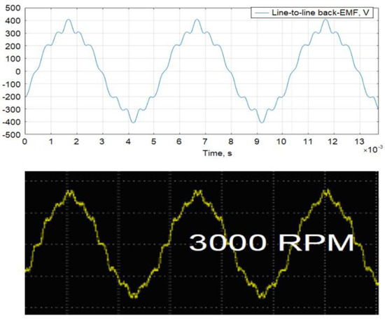 Simulated (top) and measured (bottom) line-to-line back-EMF waveforms at 3000 rpm.