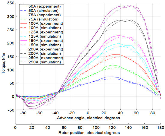 Figure 14 compares simulated and experimental torque curves. Measured torque versus rotor position curves are obtained from the experimental locked rotor test carried out for seven peak current values in the range of 50–250 A. Corresponding simulated torque versus advance angle curves are generated by d-q analysis of MotorAnalysis-PM for the same current values. It is observed that both simulated and measured torque curves follow the same trend with maximum values observed in the same range of advance angle. The distortions of the experimental torque curves are caused by the slotting since the torque is measured for stationary rotor with different rotor positions. For the simulated curves, the torque is measured with rotating rotor and, therefore, the slotting effect is not visible. The slight discrepancy between simulated and measured curves can be attributed to the change of the PM properties due to the variation of temperature during the laboratory test, while for the simulation a constant value of 80 °C is considered for the PM temperature.