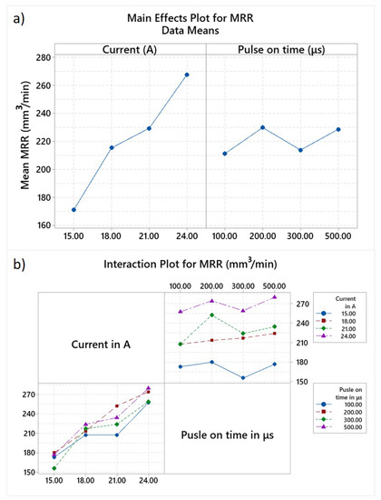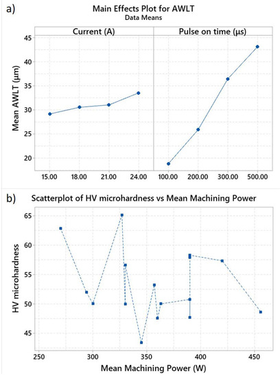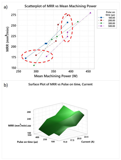 - For optimization of the machining efficiency, the interactions between machining parameters must be considered. For the same mean machining power, different MRR were measured; however, the same MRR resulted with different mean machining powers. This is the result of interactions between pulse current and pulse-on time and the manner each parameter affects the material removal mechanism.