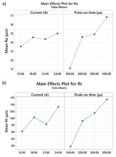 - The surface roughness mainly depends on the pulse-on time, with the measured values having statistically significant difference, when changing from 100 μs to 200, 300, and 500 μs.