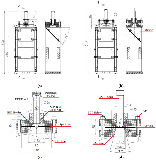 For both tests, a holder is used to prevent any material draw-in from the clamping area during the test. The clamping force was imposed employing eight M8 bolts class 8.8. The criss-cross pattern was used as a bolt tightening sequence, and the torque applied in each bolt was equal to 10 N·m. The sum of the clamping force produced by the bolts should be around 50 kN [4]. The only difference between the HET and the ECT equipment assembly is the replacement of the punch for the hemispherical tip and an appropriate holder and die for the ECT, as shown in the drawings of Figure 2c,d. The punches have a permanent magnet enclosed at the top of the tool. This magnet allows the punch to be linked to the test machine. In this way, it is possible to reset the load cell value taking into account the tool weight in the load cell presets. To reduce the friction effects during the punch displacement, a cylindrical bush PAP 2030 P20 was mounted at the holder. Additionally, a thin layer of lubricant, commonly grease, is applied between the tool contact surface and the specimen.