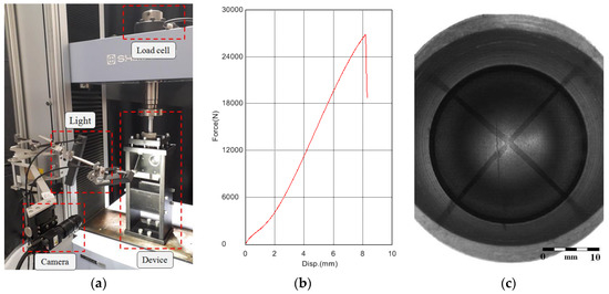 (a) Tensile testing machine setup and real-time acquisition of (b) punch force versus punch stroke and (c) deformed region image obtained from mirror projection.