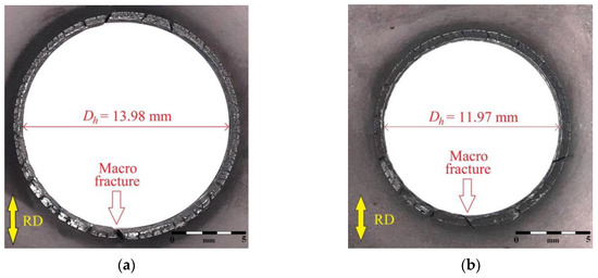 In this work, the HET was interrupted as soon as a macro fracture in the hole edge was visible. Figure 5 presents the results of the final diameter obtained for DP600 and DP780. In these pictures, the visible macro fractures are indicated by arrows. The hole diameter measurements were performed after the tests, that is, after unloading the specimens.