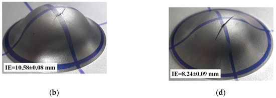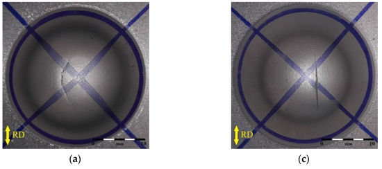 Figure 6 shows the deformed shape of both dual-phase specimens, displaying the fracture near the top of the dome and parallel to the sheet rolling direction (RD). A permanent marker was used to help align the specimen. It was also observed that the clamping force of the holder was enough, and no slipping was detected during the tests.