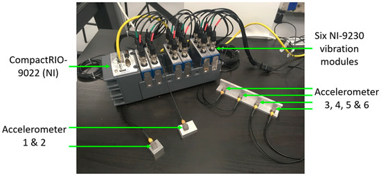 The developed multi-accelerometer live monitoring system, which includes six triaxial IEPE accelerometers, a CompactRIO-9022 controller, with an eight-module slot chassis attached and six NI-9230 vibration and sound modules integrated.