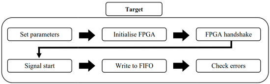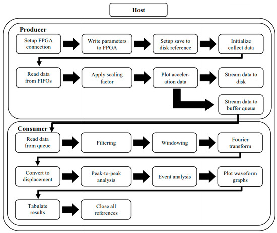 The software has been programmed to use the target and host architecture, which allows for the host computer to interact with the target virtual instrument (VI) compiled on the cRIO, while performing different operations in the host computer VI. The target VI is designed to collect data from the accelerometers and stream the data to three FIFOs (First-In-First-Out) buffers for the host VI to read. The host VI on the master computer is designed to read the data from the FIFOs in chunks, based on how much data is available when the read is requested, which will in turn depend on the sample rate and the execution time of the read loop. The host VI then performs the processing and analysis on the collected data, displaying the measurements on the front panel and streaming the data to disk. Utilising the cRIOs FPGA and the host–target architecture allows the system to achieve high sampling rates (up to 12,800 samples per second per channel), therefore, ensuring adherence to the Nyquist sampling theorem and measuring across the desired frequency range. High-level function breakdown diagrams of the target and host VIs architectures are shown in Figure 2 and Figure 3, respectively.