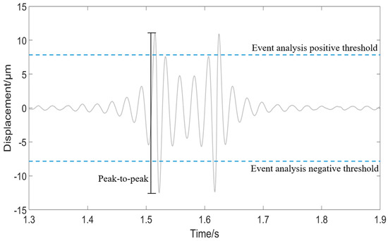 Event analysis plot to investigate the dynamic behaviour around the area of interest, which is identified by the peak above the user defined threshold (dashed line), with the peak-to-peak analysis also illustrated.