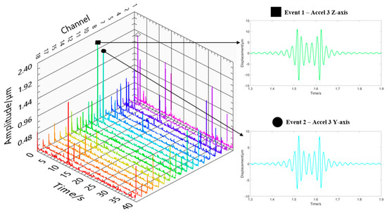 The post-measurement analysis VI displays the displacement and frequency response for all eighteen measurement channels, with the signals separated into the axis of measurement. The post-measurement analysis processing time is dependent on the total time of the measurement, in the case of a 90 s measurement the processing time for the system is approximately 20 s. Given that displaying large datasets in multiple channels is challenging for vibration measurements, a 3D stacked ribbon plot (Figure 9) was created to show the displacement envelope of all eighteen channels on a singular plot to aid clear comparison. To make the plots distinguishable, the two-dimensional plots for each of the eighteen channels are stacked and evenly spaced along a third dimension and colour coded to help with visual identification. The 3D ribbon plot has also been used to highlight the location of the identified key “events”. The 3D ribbon plot is currently not possible in the live data VI, due to the limits in RAM and processing time.