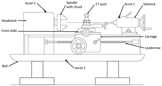 Schema of the experimental configuration showing the key components of a lathe, and the accelerometer mounting positions for the condition monitoring investigation into the effects of cutting depth and tool wear.