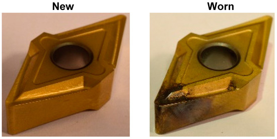 To investigate the dynamic effects of different cut depths on the condition of the system, the vibrations in three axis were measured for a range of 0.5 mm to 4.0 mm cutting depths with steps of 0.5 mm. A cut of length 100 mm was performed for each cutting depth, with a new piece of stock material used for each test. The experiment was performed once with a new cutting tip, and once using a “worn” cutting tip (shown in Figure 11), which had been used for 40 h to perform light to moderate cutting operations from a previous part, but was deemed in a “usable” condition. The cutting tips used were CP200 carbide with a TiAlN/TiN finish, diamond, 1/4″ thick, angle of 55°, and 1/32″ corner radius. A number of parameters were set throughout the experiment and have been shown in Table 2.