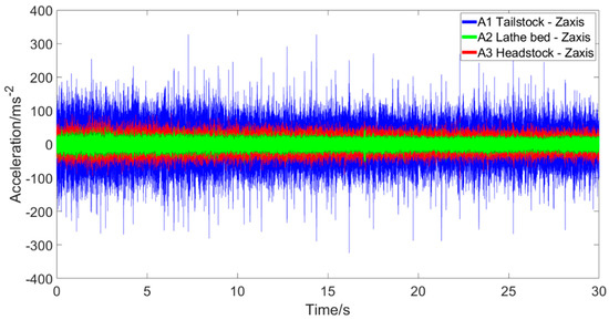 Example measured vibration dataset, collected while performing a 2 mm depth of cut on a CNC lathe using a new cutting tip.