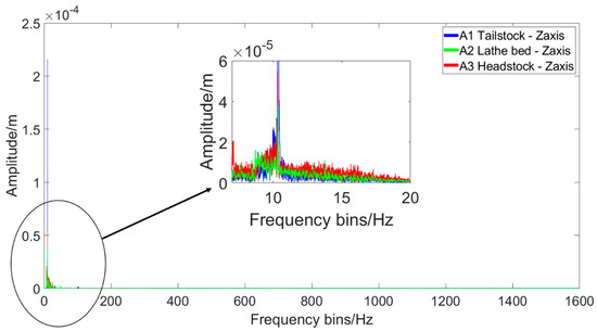 An example of the measured vibration signal for a 2 mm cutting depth using the new cutting tool can be seen in Figure 12, and the results of the frequency response analysis in Figure 13. The frequency analysis identified the largest frequency components of all three measurement positions to be at ~10 Hz, which matches well with the vibrations that would be introduced to the system due to the spindle rotating at 600 RPM. The frequency analysis also showed the main frequency components in the lathe system are between 8 Hz to 50 Hz. From each of the measured signals, the average peak-to-peak response was calculated for the cutting process. The results for the x, y, and z axes from the investigation using both new and worn cutting tips can be seen in Figure 14.