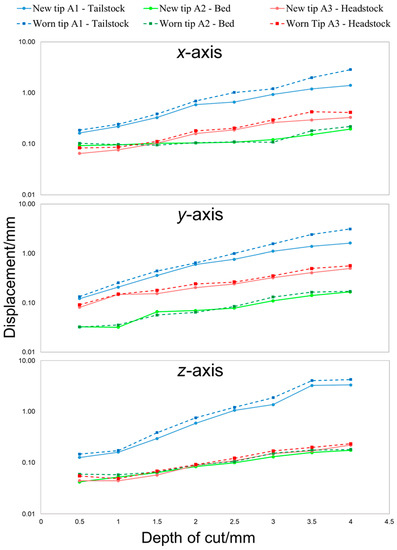 Vibration results in the x, y and z axes for the effect of increasing cutting depth and tool wear, showing the vibration increases that can be measured as the cutting tip progressively wears to predict tool failure.