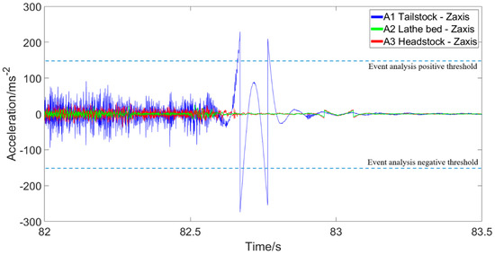 It is clear from the results that a larger cutting depth causes an increase in vibration in all three axes, and is consistent in all three positions measured. The largest variation in vibrations was in the tailstock, as it is directly connected to the work piece, and so experiences significantly increased vibration from the cutting process and the spindle rotating. The tailstock results, showed there was a marked rise in the average peak-to-peak vibration response when performing cutting operations with a worn tip compared to the new tip in all three measured axes. The trend in both the new and worn cutting tip are similar with increasing cutting depth, but there is a clear upward shift in the worn cutting tip results; this is a clear indicator of the effects of wear on tip. The clear detection of the increase in vibration due to tool wear in the tailstock demonstrates the effectiveness of the developed condition monitoring system, and shows it offers a flexible method to verify the vibration performance in a variety of applications. In the presented study of lathe cutting, further testing would allow for a vibration performance metric to be defined, which could be used to quantify the threshold of acceptable vibrations in order to monitor the condition of the cutting tip and predict tool tip failures before they occur. An example plot generated based on event analysis function of the developed system has been shown in Figure 15.