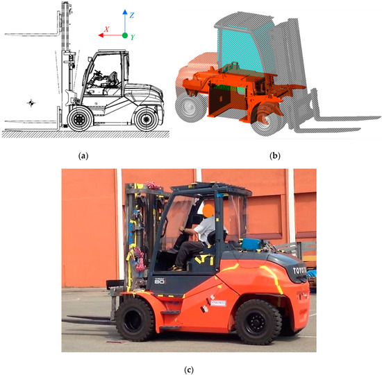 Traigo 80 forklift: (a) Full-assembly draft; (b) CAD model of the chassis; (c) Picture of the tested vehicle.