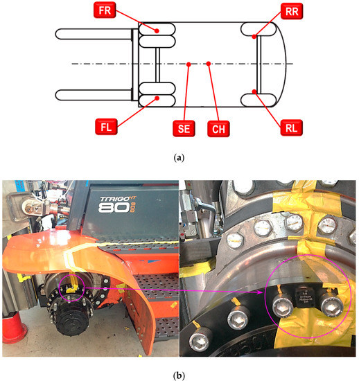 Sensor setup: (a) Schematics of the monitored locations; (b) close up of the accelerometer on the FL wheel hub.