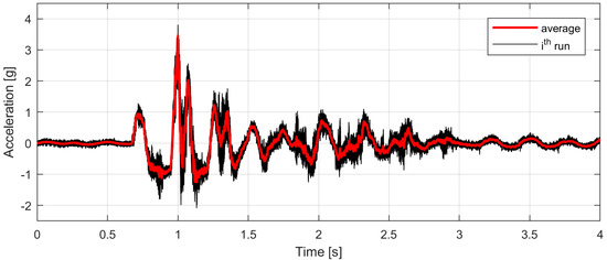 The most consistent results are obtained for the vertical acceleration (i.e., along the z-axis) of the Front Left (FL) wheel hub. The corresponding measured signals are shown in Figure 4 (all the fifteen runs are plotted with black curves). The component related to the gravitational acceleration has been subtracted from the signals. The comparison confirms the low variability of the acquisitions. The reference vertical acceleration of the FL wheel hub (referred to as , also reported in Figure 4 with a red line) is computed as an average of all the fifteen measured signals and adopted for subsequent model updating. Accordingly, the analysis is focused on signal hereafter.