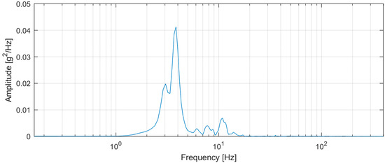 The signal is firstly investigated in the frequency domain by computing the Power Spectral Density (PSD), for a preliminary assessment of its frequency content. Figure 5 shows the PSD over the monitored frequency range 0–400 Hz. Two significant spectral lines are identified, at about 3 and 3.8 Hz, respectively. They should represent the first two resonances of the vehicle, hence being reasonably associated with its bounce and pitch vibration modes (not necessarily in this relative order). Conversely, the roll vibration mode is not expected to be excited remarkably in the test, since the forklift undergoes in-plane motion and the impact forces on the tires act almost symmetrically with respect to the global COM of the vehicle; hence, its participation to the vehicle response should be negligible. No relevant frequency content is found above 12 Hz.