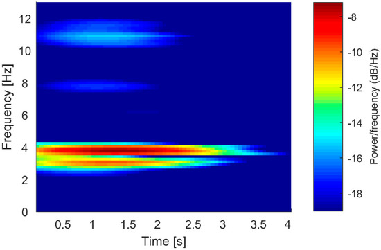Since the signal is nonstationary, time–frequency analysis is performed in order to gain better insights into its properties, by computing the Short-Time Fourier Transform (STFT). The corresponding spectrogram is reported in Figure 6, for the frequency range 0–13 Hz. The spectrogram confirms that the severe vibrations triggered by the impact with the obstacle are ascribable to two resonances, namely the two main frequency peaks observed in the PSD (Figure 5). The second vibration mode dampens after a longer time interval, thus representing the most relevant contribution to the oscillations observed in the time domain (Figure 4); hence, it is adopted for subsequent model updating.