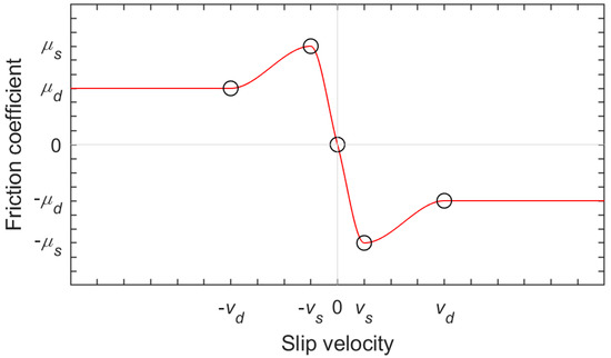 A simple Coulomb friction model is included in the contact force formulation [27]. The friction coefficient varies smoothly with the slip velocity at the contact point (Figure 9): it assumes the value μs (static friction coefficient) at vs (referred to as stiction transition velocity); it assumes the value μd (dynamic friction coefficient) for a slip velocity lower/higher than vs (referred to as friction transition velocity); the transition between the different values is described by cubic polynomial functions. It is worth noticing that real stiction is not included in the model, as the friction coefficient is equal to zero for a null slip velocity.