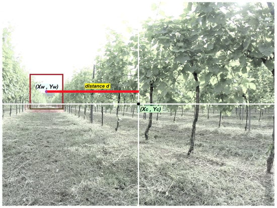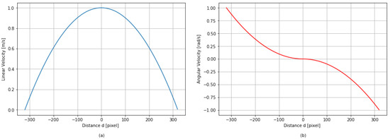 - Control values: The angular velocity and the linear velocity values are both proportional to the horizontal distance (in pixel) between the center of the detected window and the center of the camera frame and based on a parabolic function. The distance d is computed as:where is the horizontal coordinate of the center of the detected rectangle and is the horizontal coordinate of the center of the frame. Figure 2 shows a graphical representation of the computation of the distance d.