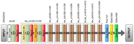 We have carefully selected a deep learning architecture from the literature that reaches high performance by also containing computational requirements and hardware costs. MobileNet [52] network, due to its efficient design, works reasonably fast on mobile devices and embedded systems without too much memory allocation. The structure of the MobileNet, illustrated in Figure 4, consists on a first convolutional layer with filters and stride followed by 13 layers that include depthwise (dw) and pointwise convolutions. That largely reduces the number of parameters and inference time while still providing reasonable accuracy level. After each convolution, batch normalization [53] and ReLU activation function [54] are applied. Every two blocks the number of filters is doubled while reducing the first two dimensions with a stride greater than one. Finally, an average pooling layer resizes the output of the last convolutional block and feeds a fully connected layer with a softmax activation function that produces the final classification predictions.