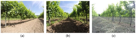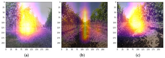 Gradient information, flowing into the last convolutional layer of MobileNet, is used to understand each neuron for a decision of interest. It is possible to assess that for either the three classes, (a–c), the network is “looking” at the vineyard roads and their vanishing point.