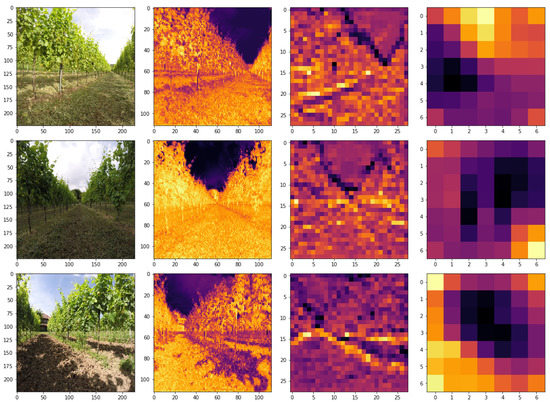 In order to inspect the model and justify the high accuracy of it, we plotted the intermediate activations of the trained network and we adopted Grad-CAM [62], to highlight important regions in the image for predicting the correct class. In Figure 6 are shown some feature maps at different level of depth: immediately after the first convolution, at an intermediate point and before the average pooling layer. It is clear how the deep learning model is able to generate robust feature maps already after the first convolution. Later those representations are exploited in order to produce disentangled representations that easily allow the model to predict the three different classes with high level of confidence. Instead, in Figure 7, are presented the regions of interest for the three different classes. With Grad-CAM we can visually validate that the network is activating around the proper patterns of the input image and that it is not exploiting short cuts to achieve a high level of accuracy. Indeed, we can easily assess that the model, trained with transfer learning, is exploiting the vineyard rows and their vanishing point to obtain an effective generalization power.