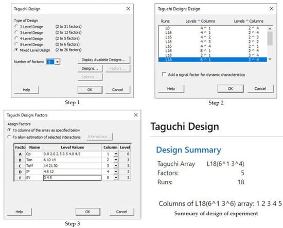 - Phadke, M.S. Quality Engineering using Design of Experiments; Springer: Berlin/Heidelberg, Germany, 1989; pp. 31–50. [Google Scholar]