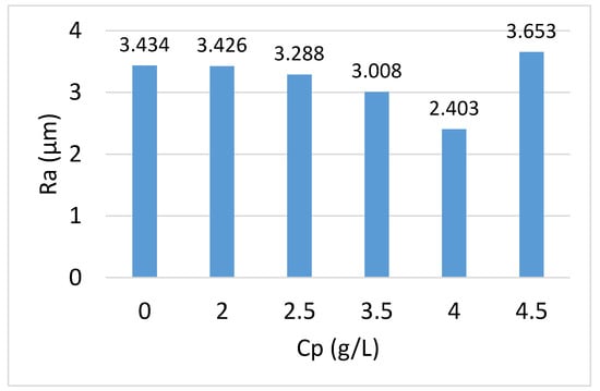 - The outstanding effectiveness in reducing the roughness of the PMEDM process has been demonstrated when compared to conventional EDM. The roughness obtained with the optimum powder concentration of 4 g/L was reduced by 30.02% compared to that when processed by conventional EDM (powder concentration of 0 g/L).