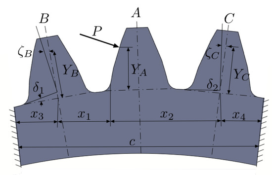 Evidently, the calculation of those errors, especially the , is crucial in understanding the dynamic interaction in geared systems and obtaining the correct Dynamic Factor and the . The first works in this direction were based on analytical formulations and the first one is by Weber [38] and later by Weber and Banaschek [39]. These works are based on the superposition of the deformation due to the contact between teeth, the deflection of a clamped-free beam with the shape of the tooth and the ring compliance. The compliance due to contact between teeth is analyzed using the bidimensional Hertz theory [40] for cylindrical contact, while Lundberg [41] proposed to consider a distribution of pressure at the surface of an elastic half plane. The clamped-free variable shape beam introduces the flexural, shear and normal compliances. The gear body is accounted for considering the tooth rigid and assuming the ring as a large elastic plane where flexural, shear and normal effects are applied. Ishikawa [42] improved the methodology by considering the tooth as a trapezoidal beam attached on top of a rectangular beam. Attia [43] introduced some modifications to Weber’s model and a sketch for its application is visible in Figure 6.