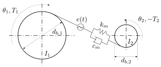 In the years between Tuplin’s [9] work and that of Bahgat et al. [80], a great number of studies were conducted and the extensive review by Ozguven and Houser [2] was surely the starting point for the model presented in [95] (Figure 7), which is similar to the one in [51] but makes a distinction between and and uses the former to compute the latter and was validated on the experimental results of dynamic root strains recorded in [96]. Using a similar model, Kahraman and Singh in [97] (Figure 8) study the dynamic behavior of a gear pair simplifying some aspects. For example, the is modeled as a sinusoidal quantity that varies with its own frequency and the fluctuation of the torque is characterized by a fundamental frequency different from the one of the , and those fluctuations make up the excitation sources. However, it introduces a non-linear trend of the elastic contribution to the force equilibrium, which is equal to zero when the displacement measured along the line of action is between the values of the backlash and is linear otherwise. The equation of motion for this model can be written as